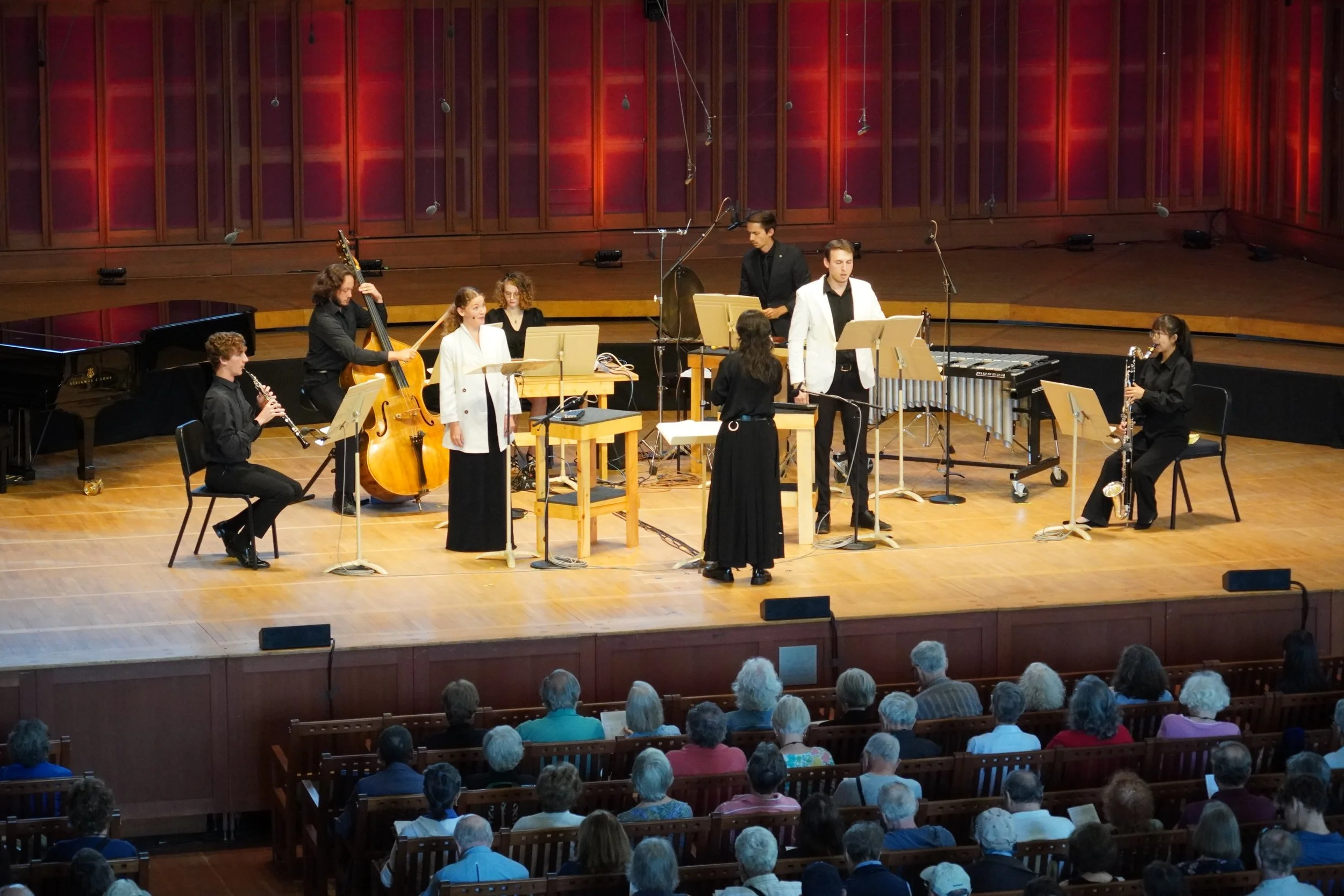 mezzo-soprano, dancer with live mic feedback instrument, percussion (vibraphone, bass drum, kick drum)
